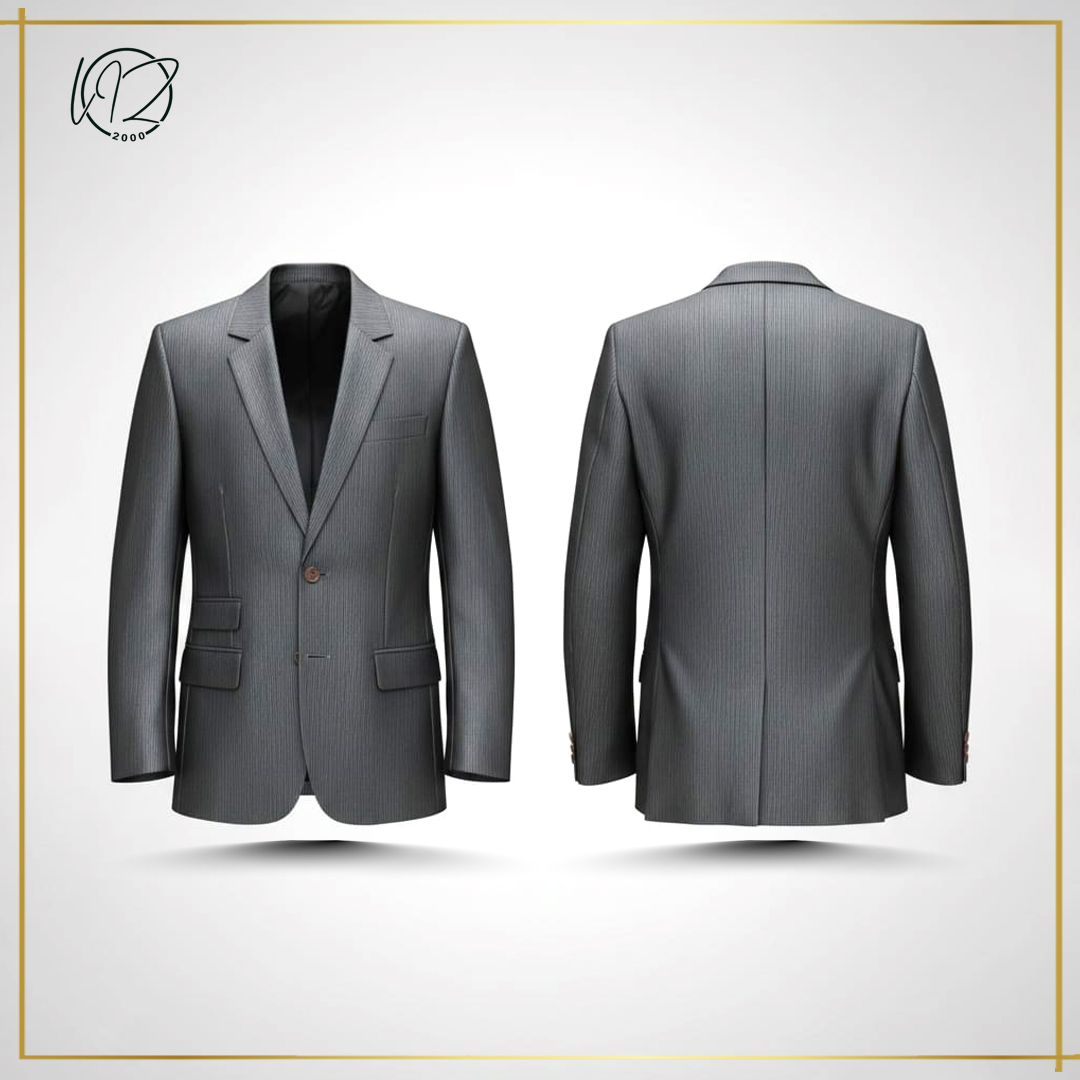 Fabric & Pattern: Features a subtle, vertical pinstripe texture on a medium-gray base, providing a visual lengthening effect and a professional aesthetic.